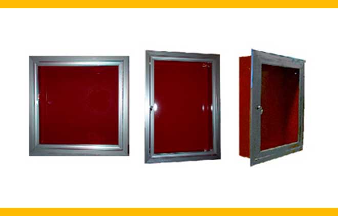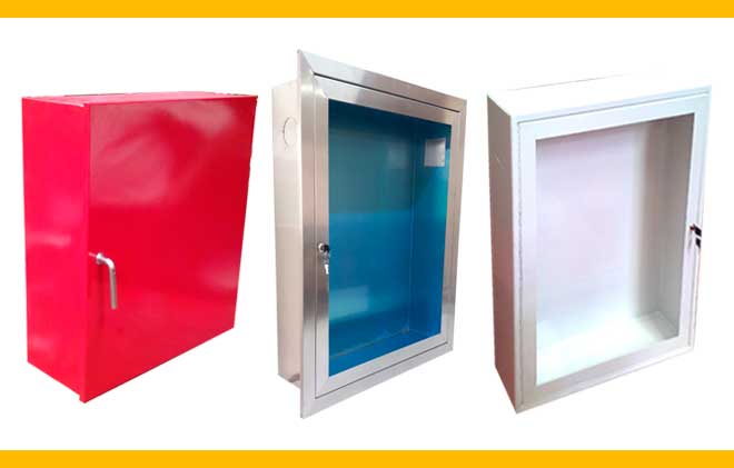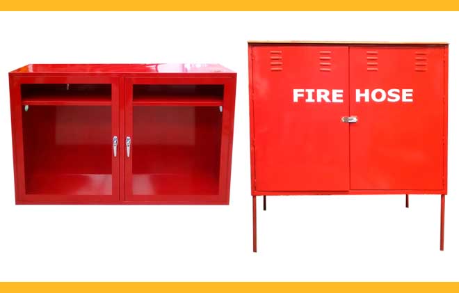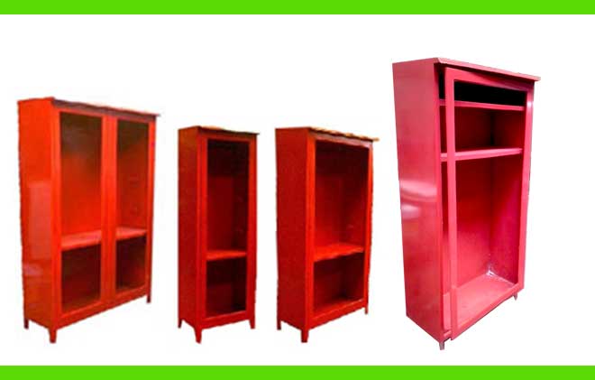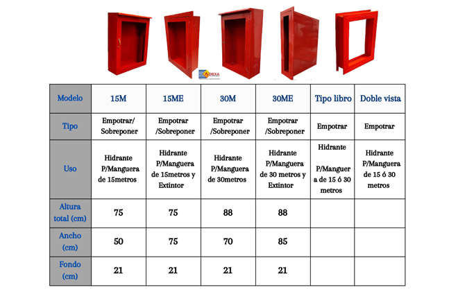 Características: Gabinete metálico para mangueras de hidrante sola o con extintor según modelo. Acabado con pintura electrostática horneada en color rojo.
